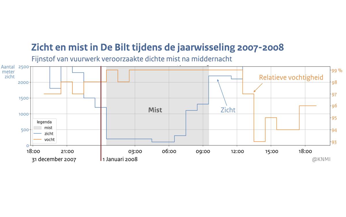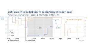 Een voorbeeld is de oudejaarsnacht van 2007/2008. Voor deze nacht laat afbeelding 1 het maximale zicht, de relatieve vochtigheid en de aanwezigheid van mist in De Bilt zien. Even na middernacht zakt het zicht van meer dan een kilometer naar minder dan 200 meter – er is mist ontstaan. In de oostelijke delen van Nederland was het zicht die nacht zelfs minder dan 50 meter.
