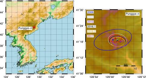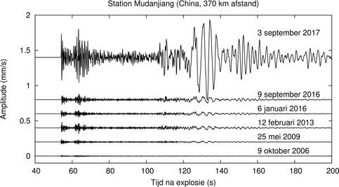 De seismische signalen, zoals gemeten door het seismische station MDJ in Mudanjiang (China) op 370 kilometer van de test locatie Punggrye-ri, laten duidelijk het verschil in grootte zien van de kernbomproeven. In figuur 2 zijn de seismische signalen van de zes kernbomproeven van Noord-Korea weergegeven. De uitslag van de seismische signalen wordt bepaald door de grootte van de nucleaire test. Van de eerste nucleaire test in 2006 zijn de seismische signalen nauwelijks zichtbaar, terwijl de recentere testen sterke signalen geven. Hieruit wordt duidelijk dat Noord-Korea steeds zwaardere nucleaire testen uitvoert.