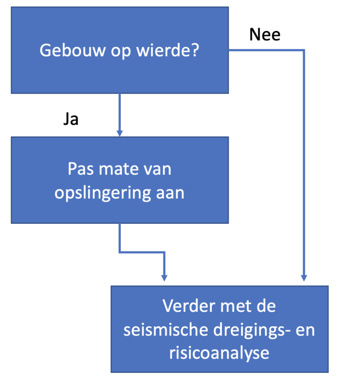 In de seismische dreigings- en risicoanalyse wordt dus één extra stap toegevoegd: er wordt gecheckt of een gebouw op een wierde ligt. Als dat zo is, dan wordt het seismische risico met een aangepaste belasting berekend (figuur 3).