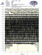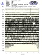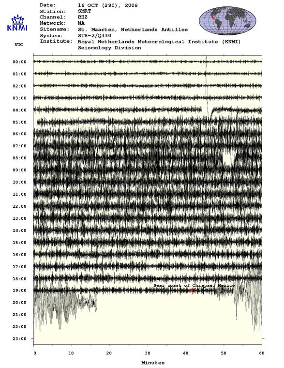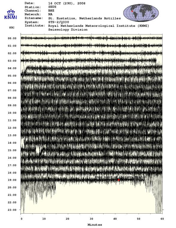 Op de seismogrammen hiernaast en hieronder is deze toename in ruis goed te zien. Het ruisniveau aan het begin van de dag is nog redelijk rustig en in de loop van de ochtend, als de orkaan nadert, wordt het ruisniveau steeds hoger. Helemaal aan het eind van het seismogram, om 19:50 uur, is een aardbeving bij Mexico te zien.