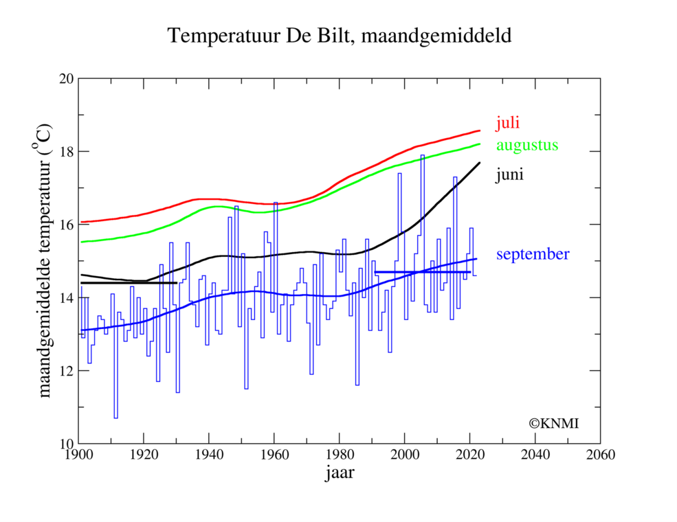 Sinds begin vorige eeuw zijn alle maanden warmer geworden. De temperatuur in september is nu zelfs iets hoger dan de temperatuur in juni begin vorige eeuw. Daarmee is september het nieuwe juni.