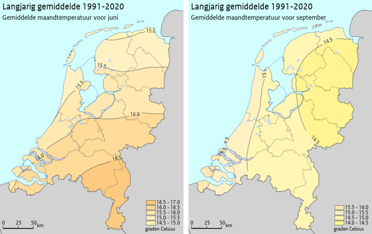 De verdeling van de temperatuur over Nederland is in september wel anders dan die in juni (figuur 2). In juni volgt de temperatuur vooral de hoeveelheid zonnestraling, met de hoogste temperaturen in het zuiden van het land, waar de meeste zon is. In september is er minder zon en speelt vooral de invloed van de Noordzee, die in de zomer is opgewarmd. Hierdoor is in september de temperatuur het hoogst in het westen van het land.
