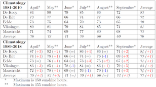 September 2019 was zonnig met 162 zonuren tegen 143 uren normaal. Vorig jaar kregen we de septemberzon zelfs gedurende 193 uren te zien. We onderzochten of er langjarige veranderingen zijn in het aantal zonuren in het zomerhalfjaar. Deze veranderingen blijken er te zijn. Vooral in de maanden mei en september is de zon in de laatste jaren vaker te zien geweest.