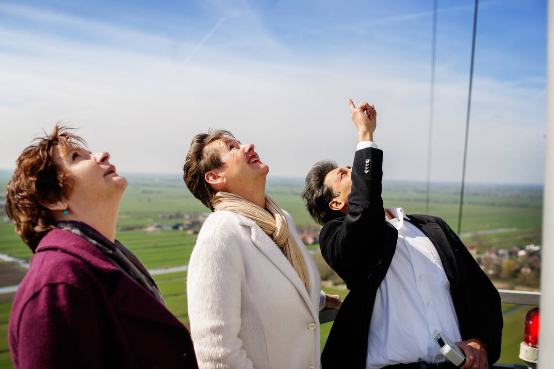 213 meter aan high-tech weer- en klimaatmetingen. Dat wilde secretaris-generaal Lidewijde Ongering van het ministerie van Infrastructuur en Milieu wel eens met eigen ogen zien. Afgelopen vrijdag ging zij, samen met Lilian van Aarsen, directeur Kennis, Innovatie en Strategie, de KNMI-meetmast in die in Cabauw staat.