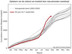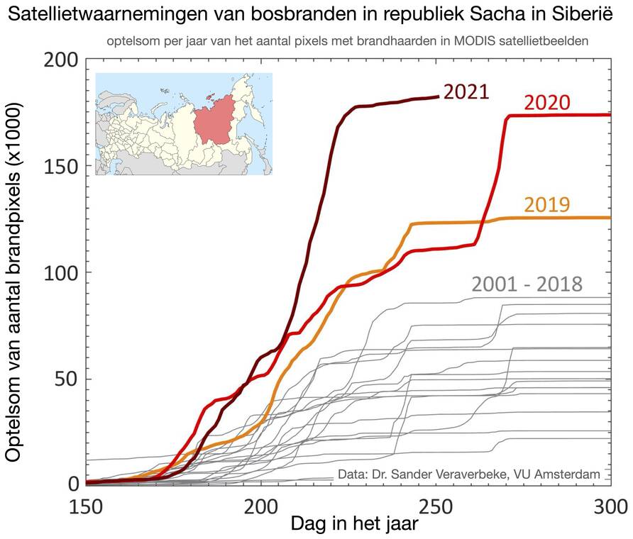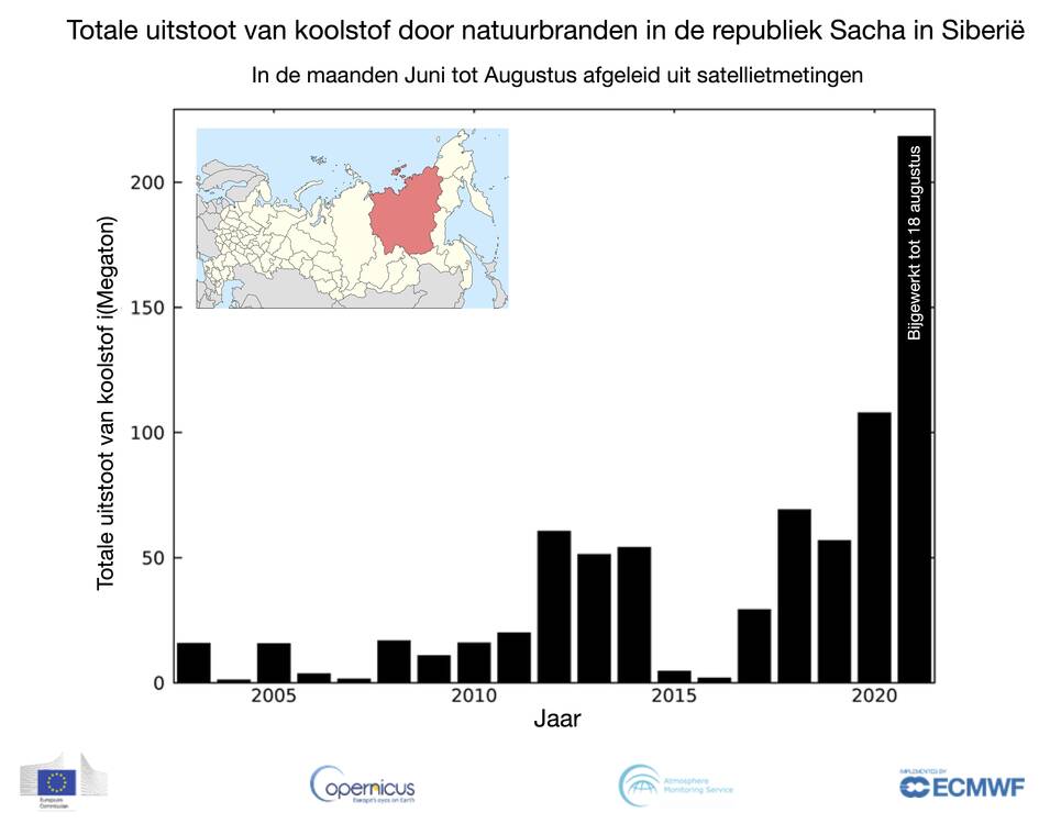 Het geschatte aantal branden in Oost-Siberië is dit jaar het hoogst sinds het begin van de metingen met het MODIS satellietinstrument in 2000, waarbij zelfs de vorige recordjaren 2019 en 2020 werden ingehaald (figuur 1). Dit leidde regionaal tot een verhoogde uitstoot van koolstof naar de atmosfeer (figuur 2). Ook wereldwijd was een hoge koolstofuitstoot te zien, als gevolg van branden die tegelijkertijd elders woedden zoals in Californië en Zuid-Europa (figuur 3).