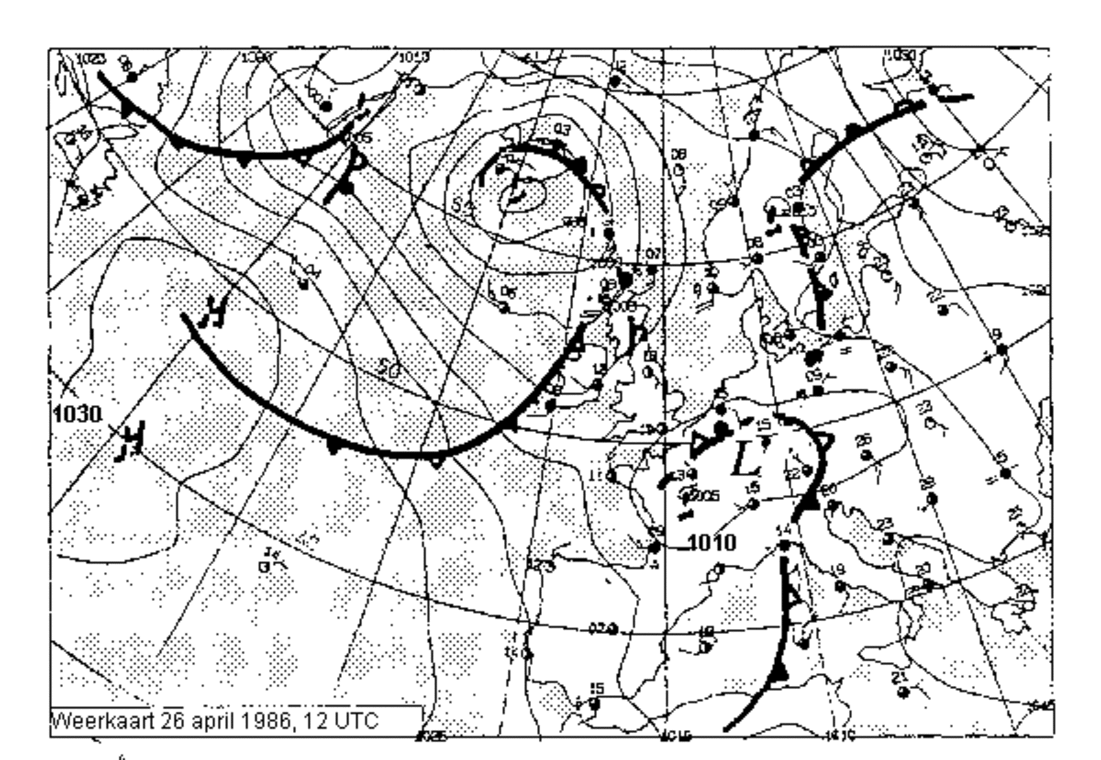 Een hogedrukgebied met zijn centrum boven west-Frankrijk heeft een uitloper naar het oosten. Het warmtefront van een lagedrukgebied ten zuiden van IJsland ligt boven de Noordzee en trekt vandaag over ons land. Als gevolg van deze weersituatie wordt vandaag met een zwakke tot matige westenwind bewolking aangevoerd. In het Waddengebied kan hieruit eerst een spatje regen vallen. Elders breekt de bewolking en vooral in het zuiden schijnt ook geregeld de zon. In deze weersituatie zal radioactiviteit uit Tsjernobyl Nederland niet bereiken.