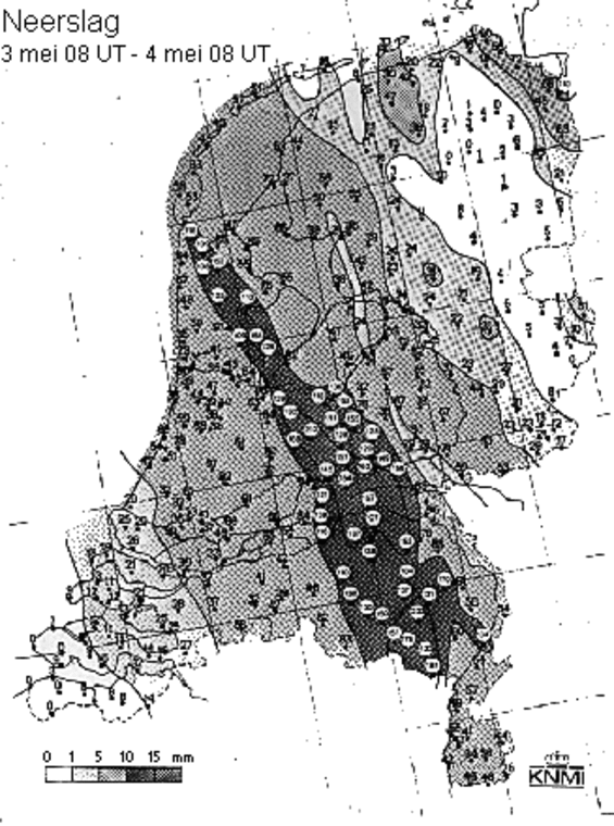 Maar de weersverwachtingen veroorzaakten in de Bilt talloze ongeruste telefoontjes: twee dagen later zou een zuidoostelijke stroming de radioactieve wolk via zuid- en midden-Duitsland naar onze streken voeren. Vanaf de avond van 2 mei tot en met 4 mei vielen er in ons land verscheidene buien. (In het plaatje (85 Kb) zijn de neerslagpatronen in het etmaal 3 mei 1986, 10 uur tot 4 mei 1986, 10 uur Nederlandse tijd te zien.)
