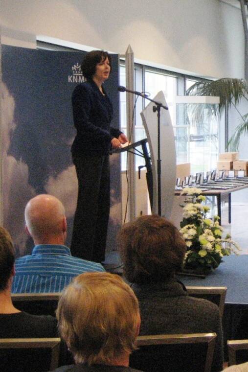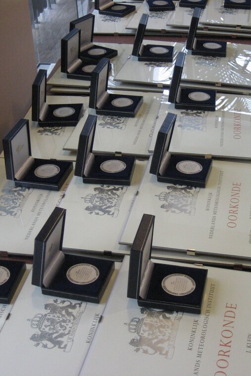 Staatssecretaris Huizinga van Verkeer en Waterstaat heeft vandaag bij het KNMI in De Bilt medailles en barometers uitgereikt aan kapiteins en stuurlieden van de Koopvaardij en de Marine voor hun verdiensten op het gebied van de meteorologie.