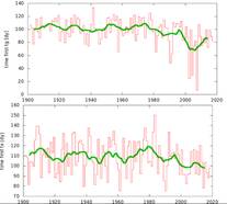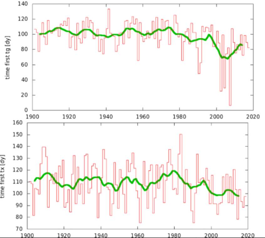 Het dagnummer vanaf 1 januari waarop de lente volgens onze definitie begint is uitgezet in figuur 1 (boven). Tot de jaren 1970 schommelt dat rond dag 100, dat is half april. Daarna wordt het gemiddeld vroeger warm, met heel vroege extreem zachte weken in 2002, 2004 en 2007. Gemiddeld begint de lente in Nederland nu ongeveer twee weken eerder dan in 1900-1970, met uiteraard variaties van jaar op jaar daaromheen. Hetzelfde geldt voor de eerste warme dag van het jaar (figuur 1 onder).