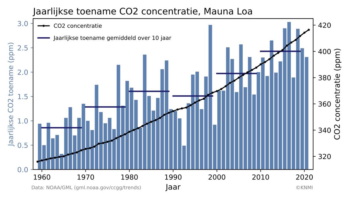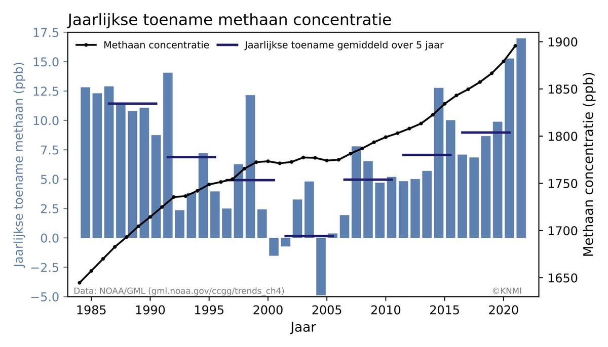 Volgens NOAA was de concentratie methaan in de atmosfeer gemiddeld over 2021 en gemiddeld over de hele aarde 1896 ppb (parts per billion oftewel het aantal methaan moleculen in elke miljard luchtmoleculen). Dat is een stijging van ongeveer 250 ppb sinds het begin van de meetreeks in 1984 met gemiddeld bijna 7 ppb per jaar (figuur 1).