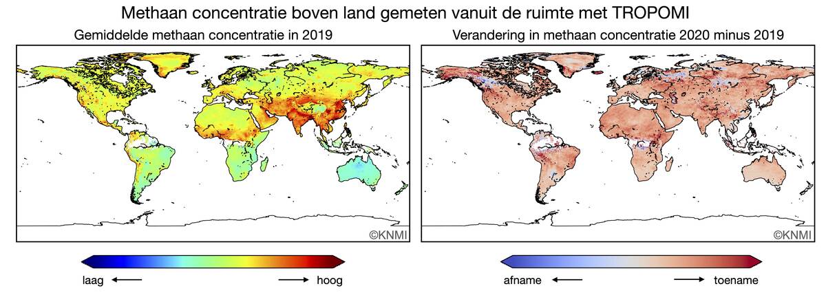 Het verschil in de methaanverdeling tussen 2020 en 2019 toont de gebieden met relatief grote jaarlijkse variaties en ook is er een gemiddelde toename te zien. In de komende jaren verwachten we een veel completer beeld te krijgen van de regio’s en de processen die het meeste bijdragen aan de toename van methaan in de atmosfeer. Dit is van belang om te zien of klimaatmaatregelen die erop gericht zijn om de uitstoot van het broeikasgas methaan te beperken ook daadwerkelijk effect hebben.