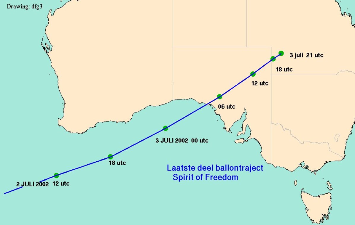 In de buurt van het plaatsje Ceduna werd de kustlijn gepasseerd op 3 juli tegen 06 UTC. Ceduna, een klein plaatsje waar de meesten wellicht nog nooit van hebben gehoord, is 4 december 2002 waarschijnlijk opnieuw in het nieuws?. vanwege een totale zonsverduistering. Veel toeristen zullen daar dan proberen de eclips te observeren. De maanschaduw raast tegen het eind van de middag met vele duizenden kilometers per uur vanuit de Great Australian Bight over het plaatsje om tegen zonsondergang in de Australische woestijn te eindigen. Hoewel er totaal geen verband is tussen Fossett's ballonroute en de eclips van 4 december 2002 is er één zeer opvallende overeenkomst. De baan die de maanschaduw boven Australië volgt is bijna identiek aan de route die de Spirit of Freedom nu heeft afgelegd.