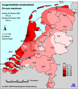 Tijdens de storm in de nacht van zondag op maandag, door Duitse meteorologen Nicole genaamd, is op veel plaatsen aan de kust windkracht 9 gemeten; IJmuiden haalde een uurgemiddelde van 26 m/sec (94 km/h), waarmee deze storm een plaats heeft gekregen op de lijst van zware stormen in Nederland sinds 1910. De sterkste windstoot werd tijdens deze storm gemeten op Vlieland waar de windmeter zondagmiddag uitschoot tot 35,0 m/sec (126 km/h).