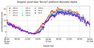 In figuur 1 is de windsnelheid (10-minuut gemiddelde waardes) op het TenneT platform Borssele Alpha, binnen het Noordzee windpark Borssele voor de Zeeuwse kust te zien. De verschillende gekleurde symbolen geven verschillende meethoogte aan, namelijk tussen 60 en 295 meter boven het zeeniveau. Te zien is hoe de wind op zondag 30 januari van zeer lage windsnelheden rond 4 meter per seconde toeneemt naar boven de 20 meter per seconde in de vroege maandagochtend 31 januari en pas maandagavond weer langzaam afneemt.