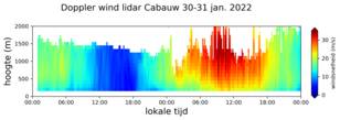 In figuur 2 is de windsnelheid op meetlocatie Cabauw te zien, met metingen tot een hoogte van 1500 tot 2000 meter, waarbij de kleur de windsnelheid aangeeft. Ook hier is de overgang van bijna windstil op zondagmiddag (blauwe kleur) naar het overtrekken van storm Corrie (rode kleur) duidelijk te zien. De hoogste windsnelheden zijn gemeten op maandagochtend en -middag, waarbij de hoogste windsnelheiden op ruim boven de 30 meter per seconde uitkomen. Een belangrijke toepassing van deze nieuwe Doppler wind lidar metingen is het toetsen en verbeteren van de weermodellen.
