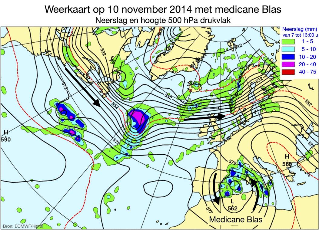 Vorige week heeft medicane Blas op Mallorca lokaal meer dan 375 millimeter regen in vijf dagen opgeleverd. Sinds afgelopen weekend is hij opnieuw geactiveerd nabij Sardinië en veroorzaakt nu veel overlast in de omringende landen. De medicane Ianos in september 2020 was de eerste met orkaankracht van categorie 2 (160 km/u) en haalde een neerslagrecord in Griekenland van 645 millimeter regen in één dag. Onderzoekers vermoeden een verband met de zeewatertemperatuur die 2 °C boven normaal was. In het formatiegebied bij de kust van Libië was het water 28 °C.