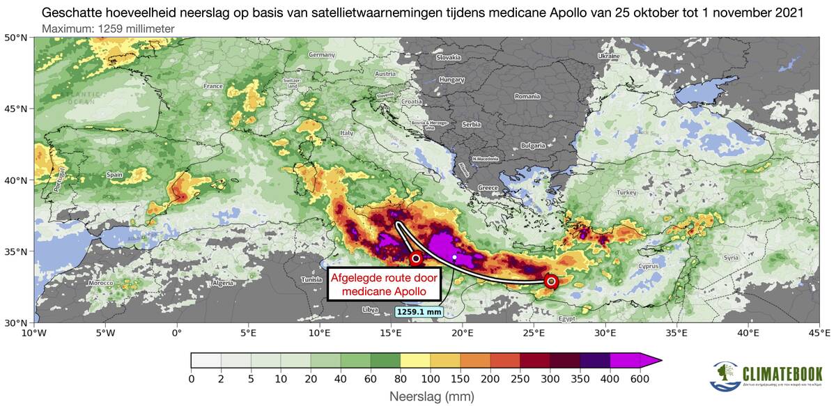 De meeste impact op de samenleving wordt niet veroorzaakt door de wind maar door de neerslag. Medicane Apollo veroorzaakte eind oktober overstromingen met dodelijke slachtoffers in Tunesië, Algerije, Italië en Malta. Op Sicilië viel lokaal 600 millimeter in 72 uur tijd. Geschatte neerslaghoeveelheden door satellietwaarnemingen laten een maximale neerslaghoeveelheid zien van 1259 millimeter, gelukkig midden op zee (figuur 3). Ter vergelijking: in De Bilt valt gemiddeld in een heel jaar 855 millimeter.