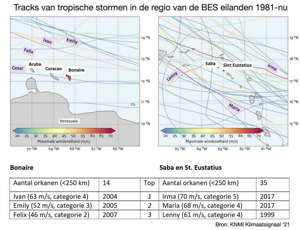 Het KNMI verzorgt de meteorologische en seismische berichtgeving voor Caribisch Nederland. Dit zijn de bijzondere gemeenten Bonaire, Sint Eustatius en Saba. Daarom bevat KNMI Klimaatsignaal‘21 ook een beschrijving van de klimaatverandering, orkanen en stormvloeden op deze eilanden. Binnen de beschikbare waarnemingen van temperatuur en neerslag vanaf 1960 wordt een toename van de temperatuur gemeten, maar is geen trend in waargenomen neerslag zichtbaar. Uit het overzicht van het aantal en de top 3 orkanen bij Bonaire en Saba/St. Eustatius blijkt dat Bonaire minder vaak getroffen wordt en de windsnelheden lager liggen (figuur 2). De reden is dat de meeste orkanen een noordelijker pad volgen. Het is echter niet uitgesloten dat een zware orkaan Bonaire kan treffen. Doordat de kustlijn van Bonaire een stuk gevoeliger is voor stormvloeden kan de impact van een relatief kleine storm bovendien groter zijn dan bij Saba en St. Eustatius.