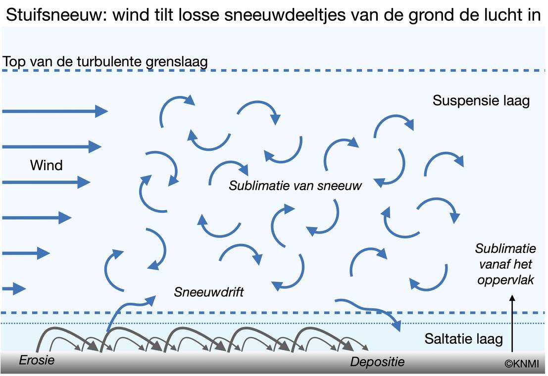 De zwevende sneeuwdeeltjes in de wind tijdens stuifsneeuw verliezen voortdurend ijsmassa door sublimatie (de overgang van ijs naar waterdamp). Sublimatie neemt toe naarmate de wervelende luchtbewegingen tijdens stuifsneeuw sterker zijn en de luchttemperatuur hoger is (figuur 3). De sneeuwdeeltjes worden zo steeds kleiner, en, logischerwijs, de omringende lucht steeds vochtiger. Door de enorme aantallen sneeuwdeeltjes die in stuifsneeuw worden meegevoerd is dit een heel efficiënt proces. Een aanzienlijk deel van de sneeuw die op de ijskap van Antarctica valt, verdwijnt op deze manier weer als waterdamp in de lucht, naar schatting zo’n 10 tot 20 procent. Samen met de sneeuwdeeltjes die over de rand worden geblazen zorgt de sublimatie van stuifsneeuw ervoor dat de ijskap minder groot/dik wordt. Stuifsneeuw op Antarctica en andere grote ijskappen als Groenland bepaalt aldus mede de veranderingen in het volume van de ijskap, en is dan ook van invloed op de zeespiegel voor onze kust.