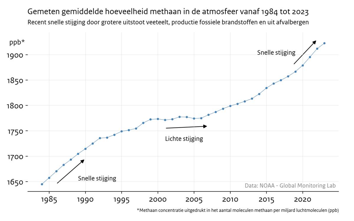 Wereldwijd warmt het klimaat op doordat de hoeveelheid broeikasgassen in de atmosfeer steeds verder toeneemt. Behalve CO2 zijn ook enkele andere broeikasgassen belangrijk. Vooral de versnelde toename van het broeikasgas methaan springt de laatste jaren in het oog. Die wordt grotendeels veroorzaakt door een stijgende uitstoot door grootschalige toename van veeteelt, een nog steeds stijgende productie van fossiele brandstoffen en meer uitstoot uit afvalbergen.