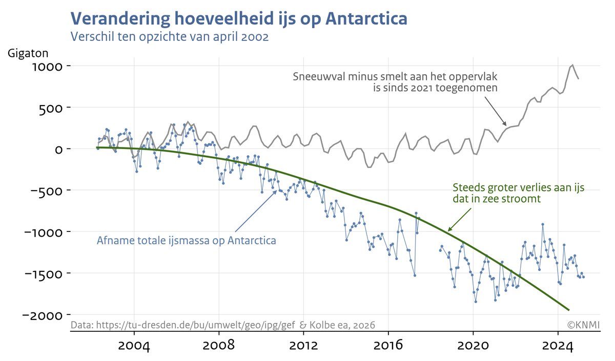 Sinds enkele decennia neemt de totale ijsmassa van Antarctica sterk af. Dit komt voornamelijk doordat de ijsplaten, drijvende uitlopers van landijs die door hoge oceaantemperaturen van onderen afsmelten, dunner worden, en sneller afbreken. Sinds 2020 lijkt echter de totale ijsmassa niet meer af te nemen. Een recente studie van het KNMI samen met andere instituten laat zien dat deze opvallende stagnering veroorzaakt wordt door een sterke toename van sneeuwval op de ijskap. Deze toename komt vooral doordat atmosferische rivieren vaker extra vochtige lucht naar de ijskap vervoeren.