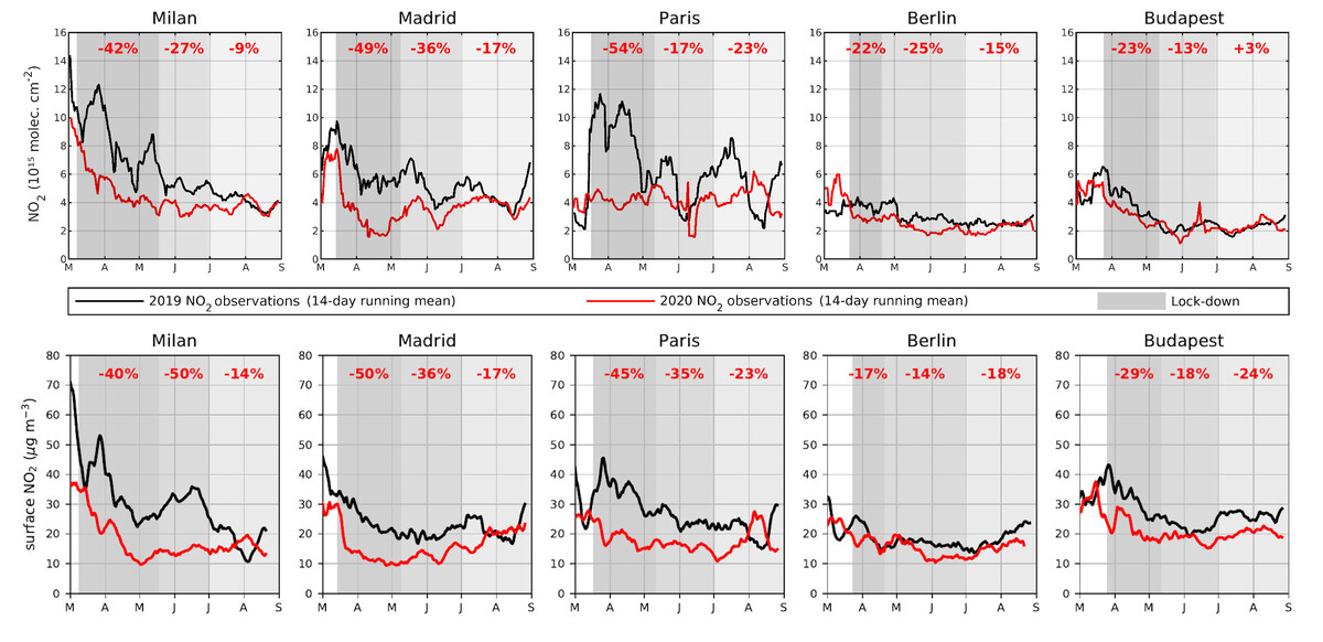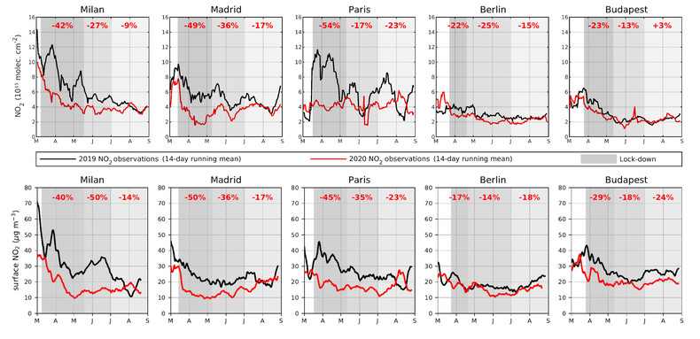 Deze veranderingen in de hoeveelheid NO2 zijn gerapporteerd door ESA, in samenwerking met het KNMI en het Belgische BIRA-IASB. In de figuur 1 zien we de tijdreeksen van maart tot en met augustus 2020, en worden de concentraties van 2020 (rood) vergeleken met 2019 (zwart). Het gemiddelde verschil tussen de twee jaren is aangegeven door de getallen, voor de quarantaine (donkergrijs), tijdens de overgangsperiode (grijs) en de periode met sterk versoepelde maatregelen (lichtgrijs). In Italië, Frankrijk en Spanje maten we reducties in NO2 tussen de 40 tot 50 procent tijdens de lockdown. Inmiddels zijn de concentraties relatief ten opzichte van 2019 weer gestegen. Maar de afbeelding laat ook zien dat de concentraties gemiddeld genomen in juli-augustus nog steeds 10 tot 20 procent lager zijn dan een jaar eerder.