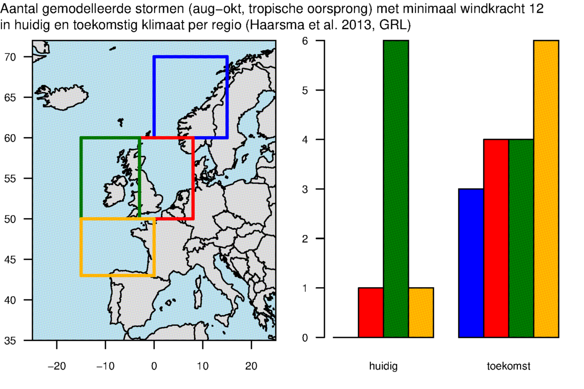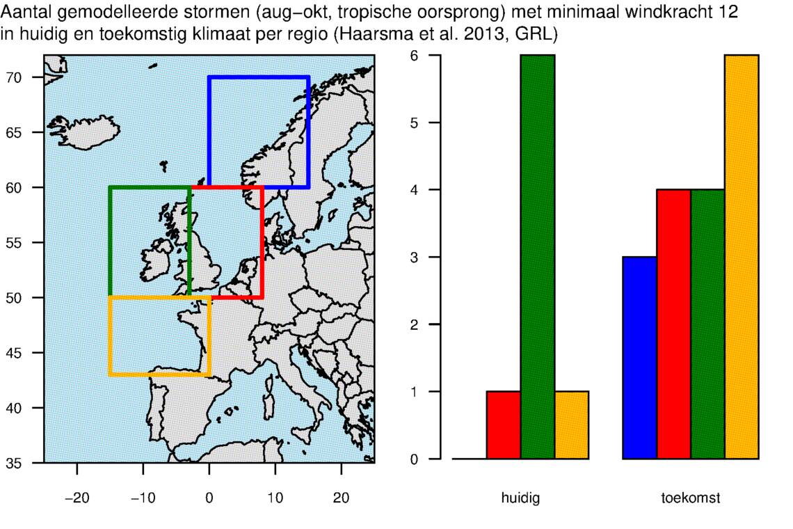 Het KNMI onderzoekt hoe vaak en met wat voor eigenschappen ex-tropische cyclonen Europa en Nederland bereiken, en hoe dit in de toekomst verandert. De voorlopige resultaten laten een toenemend risico (vaker en sterker) voor Europa en Nederland in een warmer klimaat zien. Deze bevindingen worden ondersteund door een recente publicatie van de universiteit van Princeton. In internationaal verband wordt nu hieraan verder gewerkt.