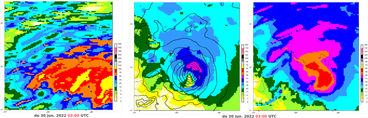 Tropische orkanen doen zelden de Caribische eilanden Aruba, Bonaire en Curaçao aan. Toch trekt vandaag een tropische storm net ten zuiden van deze zogenoemde ABC-eilanden langs. Het weersysteem is te zwak om het een orkaan te mogen noemen. Maar ook een tropische storm zorgt voor veel wind en regen en kan flink wat overlast veroorzaken. Het KNMI-weermodel HARMONIE berekende de afgelopen dagen harde tot stormachtige wind met windstoten tot 120 km/uur en 100-150 millimeter regen in 48 uur tijd (figuur 1). Of de ABC-eilanden daar ook mee te maken krijgen is nog wat onzeker omdat de precieze route van de storm per verwachting iets varieert.