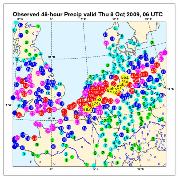 Langs de begrenzing van de warme vochtige lucht met veel koudere lucht in het noorden ontwikkelde zich dinsdag een actief buiengebied, dat vooral in het noorden van Frankrijk, België, Duitsland en het zuiden van ons land voor overlast zorgde. In de zuidelijke helft en het oosten van ons land viel op verschillende plaatsen meer dan 30 mm. Het midden van Limburg kreeg 70 tot 75 mm regen te verwerken dat leidde tot wateroverlast. Zulke enorme hoeveelheden zijn ook in België en het westen van Duitsland gevallen. Autobanen in Duitsland leken veranderd in rivieren, meldde de verkeerspolitie. In de omgeving van Reims in Frankrijk gingen de buien vergezeld van windstoten van 100 km/uur en hagel.
