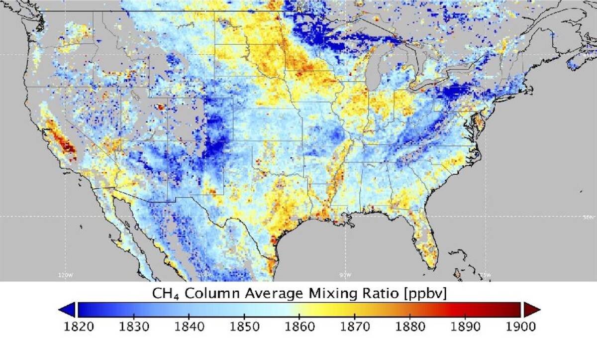 De laatste meetresultaten van Tropomi geven inzicht in de uitstoot van methaan op enkele grote winlocaties voor olie en gas. De belangrijke wingebieden in de Verenigde Staten zijn vanuit de ruimte terug te vinden aan de hand van de hoeveelheid methaan. Onder andere grote gebieden in Texas springen er uit (figuur 1). Dit blijkt uit een studie van de universiteit van Colorado in samenwerking met het KNMI. De studie toont aan dat niet alleen grote lekkages, maar ook de reguliere olie- en gaswinning nu van dag tot dag vanuit de ruimte kan worden gemeten. Figuur 2 toont als voorbeeld een meting op één dag boven de grote olie- en gasgebieden in Texas. Metingen vanuit de ruimte aan de hoeveelheid methaan die vrijkomt bij de reguliere olie- en gaswinning waren tot voor kort nog ondenkbaar.