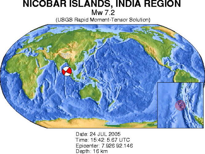 Op 24 juli 2005 heeft zich om 17:42 Nederlandse tijd een zware aardbeving voorgedaan 450 km ten noordwesten van Sumatra. De beving had een kracht van 7,2 op de schaal van Richter.