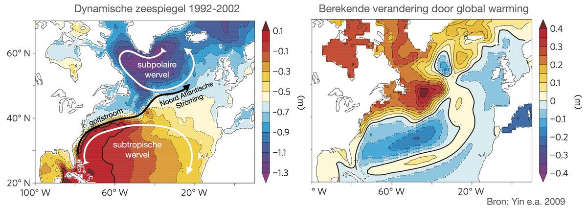 De stand van de zeespiegel wordt beïnvloed door oceaanstromingen. Zo staat de zeespiegel ruim een meter hoger aan de warme kant van de Golfstroom (figuur 1). Klimaatmodellen laten zien dat een vertraging van de Golfstroom ervoor zorgt dat de zeespiegel extra zal stijgen langs de oostkust van de VS (figuur 1). Er zijn eerste aanwijzingen dat dit nu ook gebeurt.