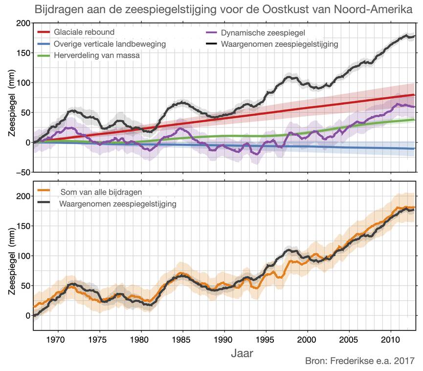 Onderzoekers van de TU Delft hebben een zorgvuldige analyse gemaakt van de metingen van de hoogte van de zeespiegel daar tussen 1965 en 2015 (figuur 2). Deze is in die periode 17,5 cm gestegen. Daarvan is 7,5 cm het gevolg van het feit dat de kust daalt. De aardkorst is namelijk veerkrachtig en reageert nog op het verdwijnen van het zware gewicht van de ijsmassa’s uit de laatste IJstijd (postglaciale rebound). Door veranderingen in de massaverdeling (minder ijs op land, meer water in de oceaan) verandert de stand van de zeespiegel. Dit heeft 3,5 cm bijgedragen aan de zeespiegelstijging. Blijft over 6 cm stijging als gevolg van een afname in de dichtheid van het water in de subpolaire wervel die gepaard gaat met de verzwakking van de AMOC en de Golfstroom (paarse lijn in figuur 2). Deze laatste twee bijdrages laten de zeespiegel versneld stijgen. Als de waargenomen verzwakking van de AMOC inderdaad het signaal is wat de klimaatmodellen laten zien als reaktie op toenemende broeikasgasconcentraties in de atmosfeer, dan verwachten we dat de AMOC verder zal afzwakken en bijdragen aan de zeespiegelstijging voor de oostkust van de VS.