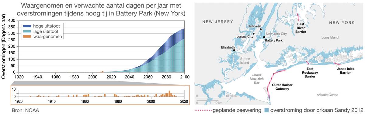 De kans op overstromingen bij hoog water neemt snel toe met een stijgende zeespiegel. Het aantal dagen per jaar dat bij hoog water de zuidpunt van Manhattan overstroomt is aan het toenemen (figuur 3). Gebeurde dat in 2011 nog op 10 dagen per jaar, de verwachting is dat dat zal zijn opgelopen tot gemiddeld 50 dagen per jaar in 2050. De wateropzet door orkaan Sandy in 2016 leidde tot grote overstromingen in een flink deel van New York. Plannen om New York weerbaarder te maken tegen toekomstige overstromingen in de vorm van zeeweringen zijn volop in de maak (figuur 3).