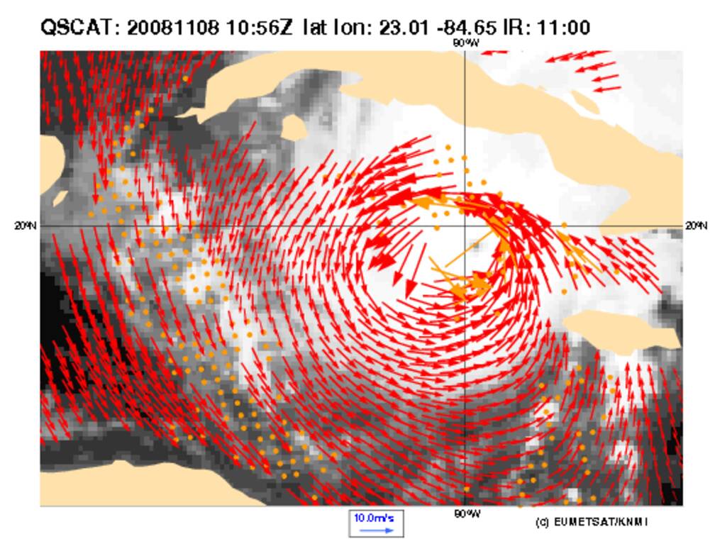 Windrichting en -snelheid aan het oppervlak van de zee worden ook gemeten met een scatterometer, een satelliet radarinstrument aan boord van de MetOp, QuikScat en ERS satellieten. In opdracht van EUMETSAT verwerkt het KNMI de gegevens van deze drie verschillende scatterometers van EUMETSAT, ESA en NASA/NOAA. Scatterometerwinden zijn gemiddelden over een gebied ter grootte van ongeveer 25 km. De windgegevens van de scatterometers die het KNMI aanlevert, worden door het National Hurricane Centre in Miami gebruikt voor het maken van hurricane-voorspellingen (zie afbeelding onder artikel).