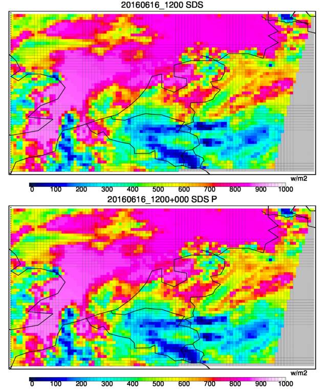 De animatie laat een zomerse dag met naderende bewolking vanuit het zuiden zien. Het bovenste paneel laat de satellietwaarnemingen van zonnestraling zien en het onderste paneel de verwachtingen. Kort na aanvang van de tijdsperiode vallen de waarnemingen en de verwachtingen nagenoeg samen. Omdat de methode gebaseerd is op het verplaatsen van een begintoestand naar de toekomst zal de satellietverwachting minder goed worden naarmate de tijd verstrijkt. Na een uur of drie blijkt het beter te zijn om over te stappen op de verwachting van een weermodel. Een goede verwachting van zonnestraling zal daarom een hybride karakter hebben: voor de korte termijn op basis van satellietdata en voor de langere termijn op basis van een weermodel.
