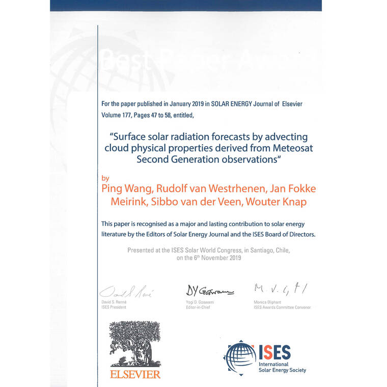 Het hierboven beschreven werk staat in detail beschreven in een artikel dat gepubliceerd is in het tijdschrift Solar Energy. Tijdens het Solar World Congress in Santiago, Chili, op 6 november jl., werd het artikel gewaardeerd met de “Best paper award” door de editors van Solar Energy en het Board of Directors van de International Solar Energy Society (ISES). Het artikel werd beschouwd als een belangrijke en blijvende bijdrage aan de literatuur die op het gebied van zonne-energie verschenen is.