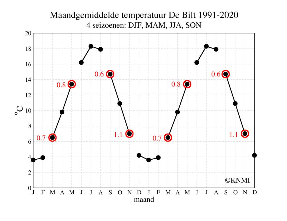 Opgeteld over de vier rood omcirkelde maanden blijkt deze maat kleiner bij vier seizoenen (3,2 graden) dan bij zes seizoenen (4,2 graden). Dit komt vooral doordat, in ieder geval wat betreft de temperatuur in De Bilt, december beter past bij januari dan bij november en juni beter past bij juli dan bij mei.