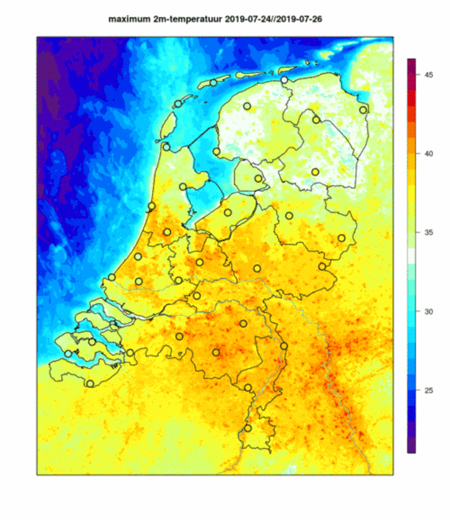 Het wordt gemiddeld warmer en de kans op hoge uitschieters neemt toe. Op 25 juli 2019 werd het in De Bilt 37,5 graden. Destijds achtten we de kans op een dergelijke temperatuur slechts eens in de 30 jaar. Voor Gilze-Rijen was de situatie wat extremer. Of de weersystemen die bij ons tot hittegolven leiden in de toekomst vaker of minder vaak gaan voorkomen is nog onzeker. Wat wel vrijwel zeker is, is dat de opwarming doorgaat. Als we dezelfde definitie blijven hanteren voor een hittegolf (5 dagen boven 25 graden waarvan 3 minstens boven 30 graden) dan zullen hittegolven in een warmer Nederland dus niet alleen vaker voorkomen, ze zullen warmer zijn, langer duren, en grootschaliger zijn.