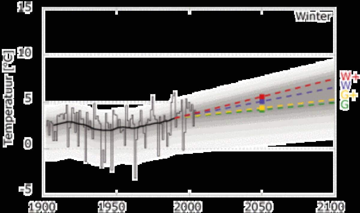 Het verloop van de huidige winter past volledig in het patroon van de laatste dertig jaar. Uit de klimatologische gegevens blijkt dat de opwarming vooral plaatsvindt in de maanden januari en februari. December doet het minst mee aan de opwarming van het klimaat. Die maand was deze winter ook amper kouder dan normaal. De komende decennia kan er best nog eens een koude winter volgen maar de verdere opwarming van het klimaat maakt de kans daarop steeds kleiner. Volgens de KNMI-scenario's liggen de gemiddelde wintertemperaturen rond 2050 tussen 0,9 en 2,3 graden hoger dan in basisjaar 1990.