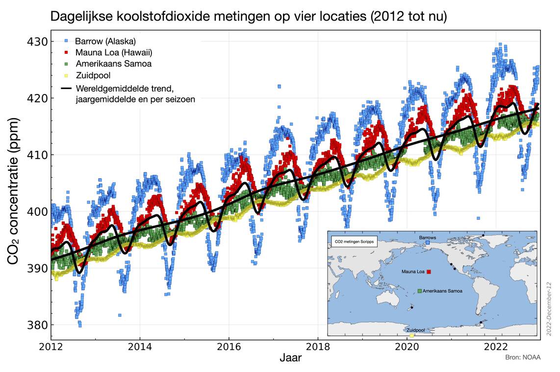 De metingen laten zien dat op het zuidelijk halfrond (American Samoa en South Pole) de seizoensvariatie, de verandering in CO2-concentratie tussen het begin van de lente en het einde van de zomer, kleiner is dan op het noordelijk halfrond (figuur 2). Dit komt doordat er minder landoppervlak is op het zuidelijk halfrond en dus minder planten en bomen die in het zomerhalfjaar CO2 uit de lucht kunnen opnemen. Ook ligt de gemiddelde concentratie CO2 op het zuidelijk halfrond iets lager, dit door minder uitstoot van CO2 door de mens op het zuidelijk halfrond.