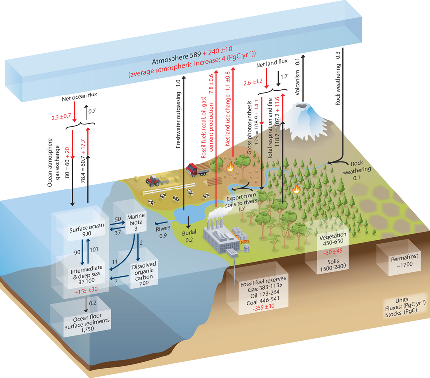 De afbeelding geeft waarden aan hoeveel koolstof er per jaar wordt uitgestoten (PgC/yr). Bij vulkaanuitstoot staat er 0.1 PgC/yr wat inhoudt dat er gemiddeld 0.1 × 10^15 gram koolstof per jaar uit vulkanen komt. Verbranding van fossiele brandstoffen door de mens brengt 7.8±0.6 PgC/yr aan CO2 in de atmosfeer. Verandering in landgebruik (voornamelijk omhakken van regenwouden) doet daar nog eens 1.1±0.8 PgC/yr bovenop.