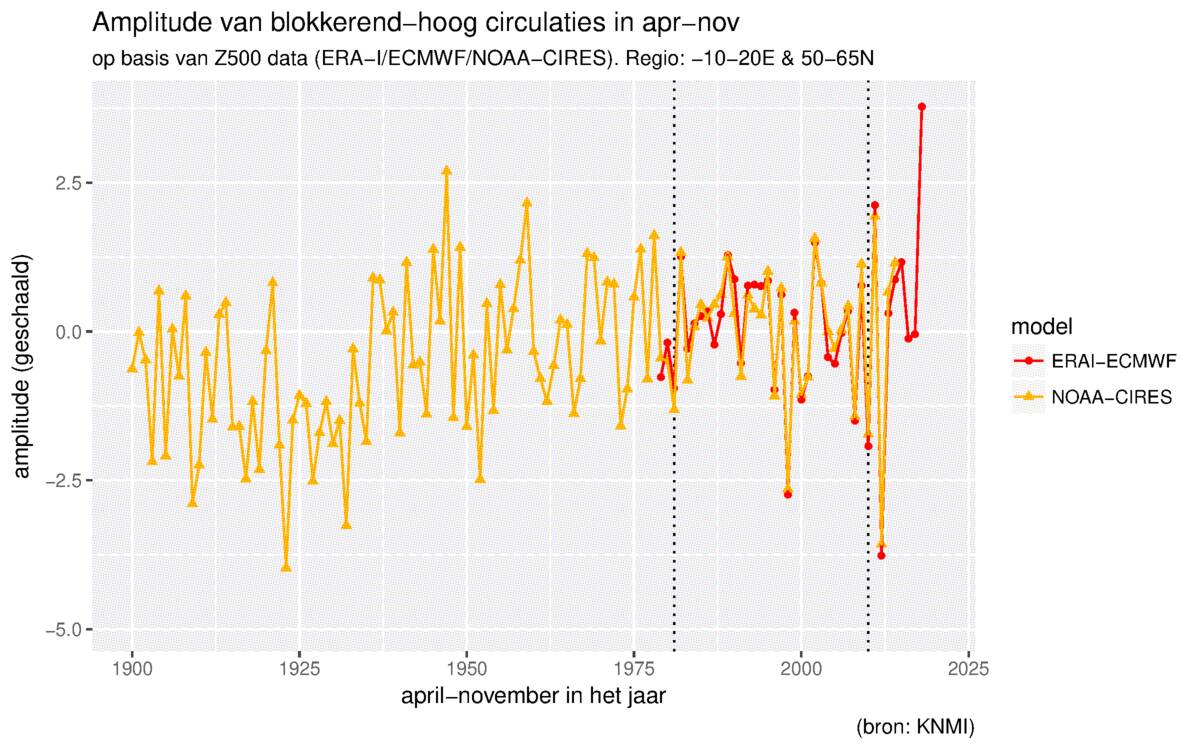 Een simpele hogedruk-index op basis van afwijkingen ten opzichte van de gemiddelde stroming (figuur 2) laat zien dat we niet eerder in de recente geschiedenis een hogedrukgebied van dergelijke amplitude en tijdsduur in de buurt hebben gehad. In de periode van 1 april tot eind november 2018 (244 dagen) was de index zelfs op 179 dagen positief. Ook in een reconstructie van het klimaat die teruggaat tot het begin van de vorige eeuw (oranje lijn), zien we dergelijke hoge waarden van de index niet terug.