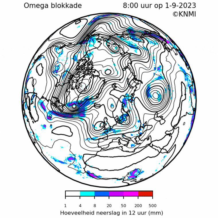 Tijdens de eerste twee weken van september 2023 viel er in verschillende landen rond de Middellandse Zee hevige neerslag. Dit had te maken met de ligging van de straalstroom, een gebied van sterke westenwinden hoog in de atmosfeer. Normaal gesproken voert de straalstroom lagedrukgebieden vanaf de Atlantische Oceaan richting Europa. Deze zorgen bij ons voor wind en regen. Maar soms buigt de straalstroom met een grote bocht om ons land heen en leidt de lagedrukgebieden om ons land heen. Een hogedrukgebied bepaalt dan ons weer. Het hogedrukgebied wordt aan beide kanten ingesloten door een lagedrukgebied. Op een weerkaart ziet dat eruit als de Griekse letter Omega (figuur 1). Zo’n blokkerend weerpatroon wordt daarom ook wel een omega-blokkade genoemd en kan soms wekenlang het weerbeeld bepalen.