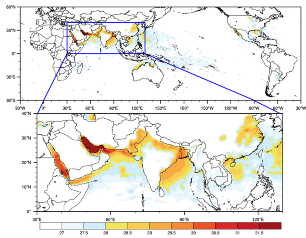 Ons klimaat verandert: we kunnen vaker en op steeds meer plaatsen hogere temperaturen verwachten. Hogere temperaturen betekenen per definitie ook hogere natteboltemperaturen. Waarden van ver boven de 30 graden Celsius komen niet vaak voor, maar zijn wel gemeten. Met name in delen van Zuidoost-Azië en het gebied rondom de Perzische Golf worden deze extremen met enige regelmaat gehaald (figuur 2). Zo zijn er ook deze zomer bijvoorbeeld in Iran natteboltemperaturen gemeten van ruim 33 graden Celsius. In het Middellandse Zeegebied worden in de zomer regelmatig waarden tussen de 25 en 30 graden Celsius gemeten. In ons land zijn tijdens de meest warme én vochtige dagen natteboltemperaturen van ruim 20 graden Celsius mogelijk.