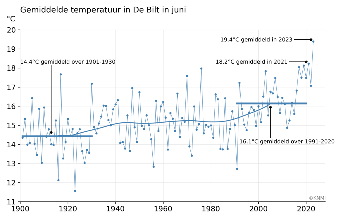 Met een gemiddelde temperatuur van 19,4°C was juni ruim 3 graden warmer dan normaal. Een junimaand zoals deze is ook in ons huidige klimaat uitzonderlijk. In De Bilt komt dit gemiddeld nu eens in de 45 jaar voor. Aan het begin van vorige eeuw was zo'n warme junimaand vrijwel onmogelijk.