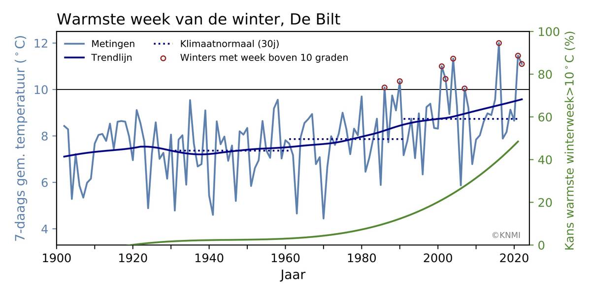 Met de stijging van de gemiddelde wintertemperatuur neemt ook de kans op warme winterweken toe. Dat is duidelijk te zien als we de temperatuur in De Bilt bekijken van de warmste week in de winter sinds 1901 (figuur 2). De eerste winter met een warme week die gemiddeld boven de 10 graden uitkwam was 1986. De huidige winter is inmiddels de negende winter met zo’n warme week (11,1 graden gemiddeld tussen 28 december 2021 en 3 januari 2022). Het weekgemiddelde warmterecord staat op 12 graden, in de winter van 2016.