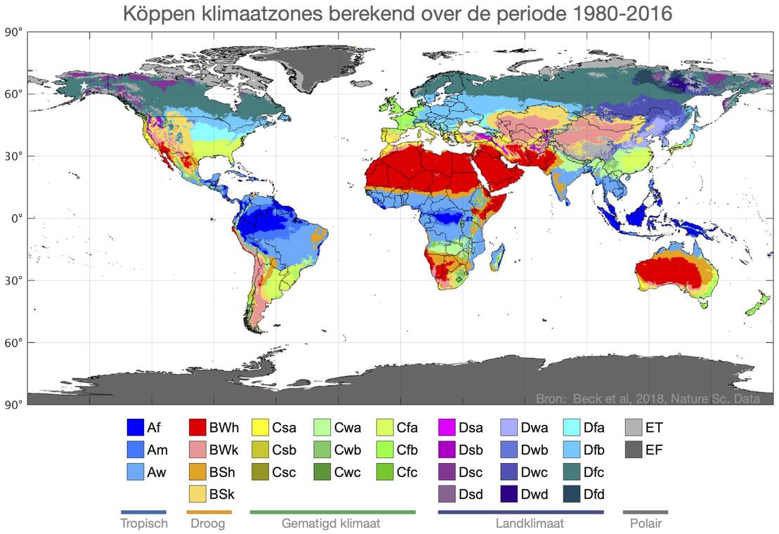 De klimaatzones, zoals we die nu gebruiken, gaan al een hele tijd terug. Het idee hiervan is in 1918 uitgewerkt door Wladimir Köppen, naar wie de onderverdeling ook genoemd is. Het systeem bestaat uit vijf hoofd zones (aangegeven met de letters A-E; van tropen tot poolklimaat). Twee sub-letters geven een iets preciezere uitleg over: 1) de neerslag; en 2) de temperatuur in de zomer. Ze zijn zo gekozen dat er een duidelijke link is met de soorten vegetatie die in de verschillende klimaatzones voorkomen. Een voorbeeld: Nederland heeft een Cfb-klimaat, wat staat voor een gematigd klimaat (C) zonder droog seizoen (f) en met een gematigde zomer (b). De warmste delen van Alaska werden tot nu toe geclassificeerd als Dfc-klimaat: een subarctisch landklimaat (figuur 1).