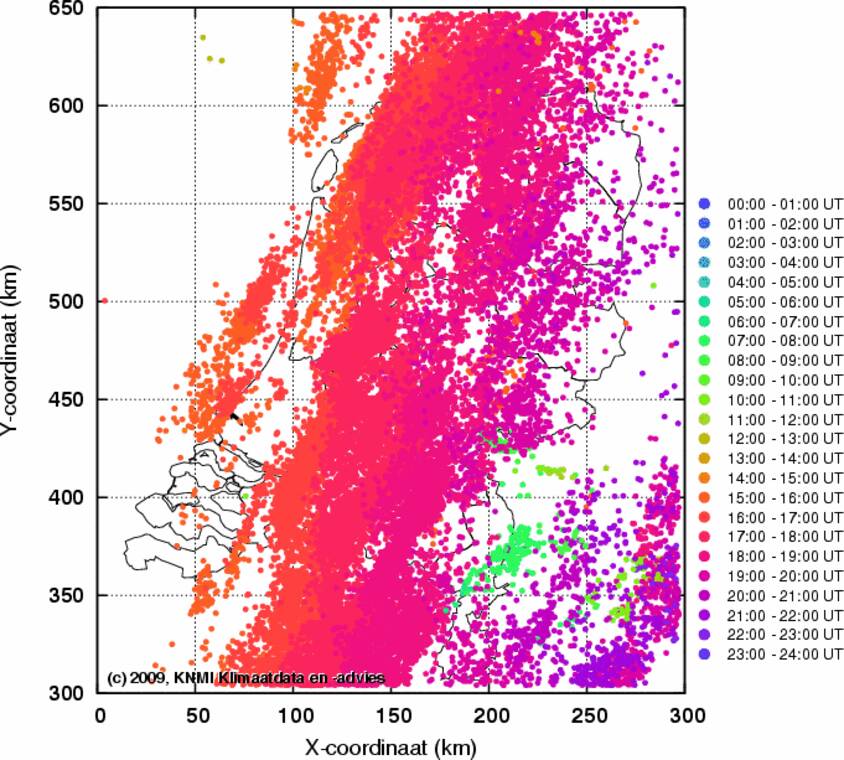 Donderdagavond, enkele uren later dan aanvankelijk verwacht, trok een gebied met lokaal fikse onweersbuien over het land. Het bliksemmeetsysteem registreerde op grote schaal meer dan 500 ontladingen per vijf minuten.