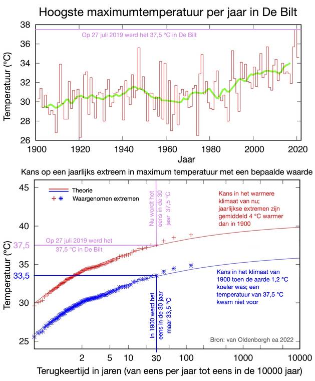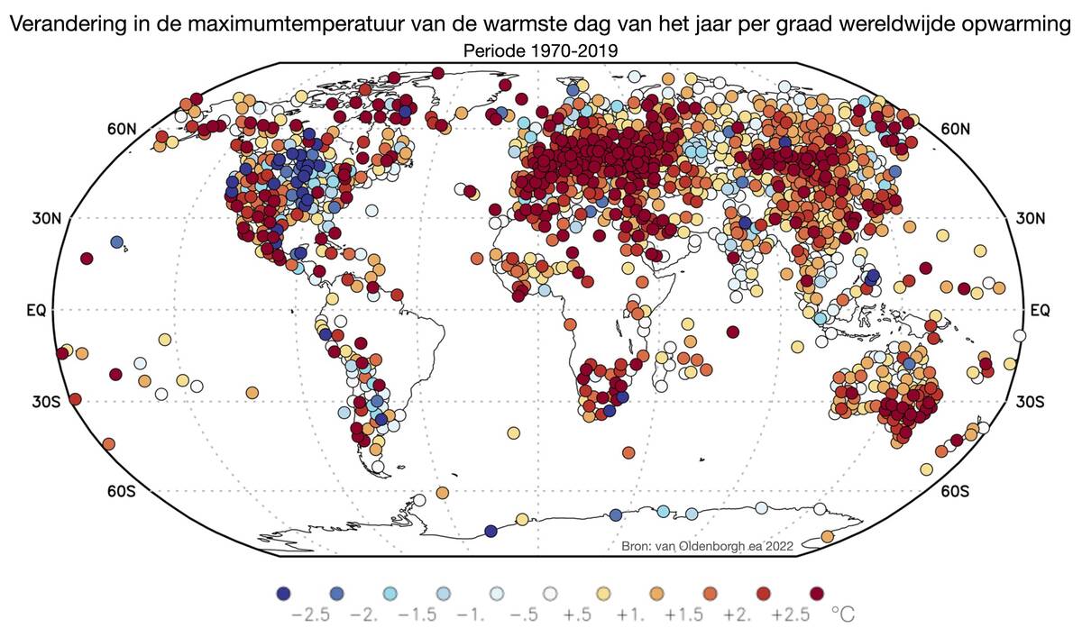De gemiddelde temperatuur op aarde is sinds 1900 met 1,2 graden gestegen. Maar de hoogste maximumtemperatuur per jaar in De Bilt is met 4 graden gestegen. Voor elke graad wereldwijde opwarming neemt de warmste dag in het jaar in De Bilt met maar liefst 3,3 graden toe. Dit blijkt uit het laatste artikel van klimaatwetenschapper Geert Jan van Oldenborgh. Onze dierbare collega overleed in oktober 2021, maar bleef tot op het laatst werken aan methodes om uit te rekenen hoe de wereldwijde opwarming weersextremen beïnvloedt.